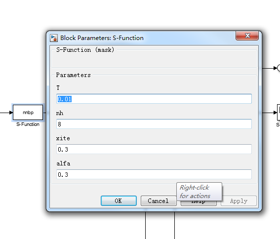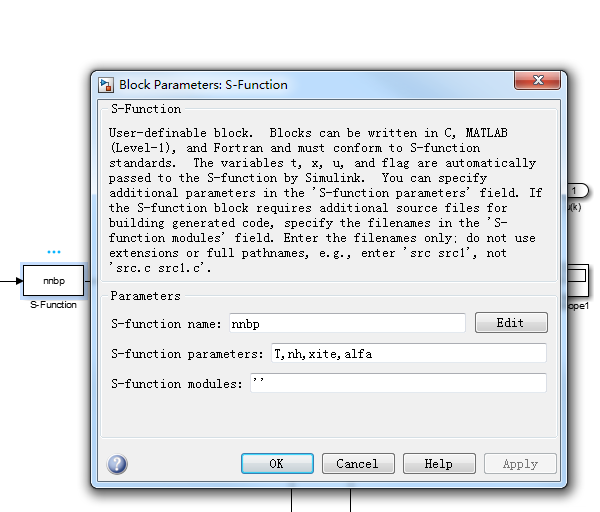 完成后点击S-function函数,会弹出外部参数设置框,设置参数如下: