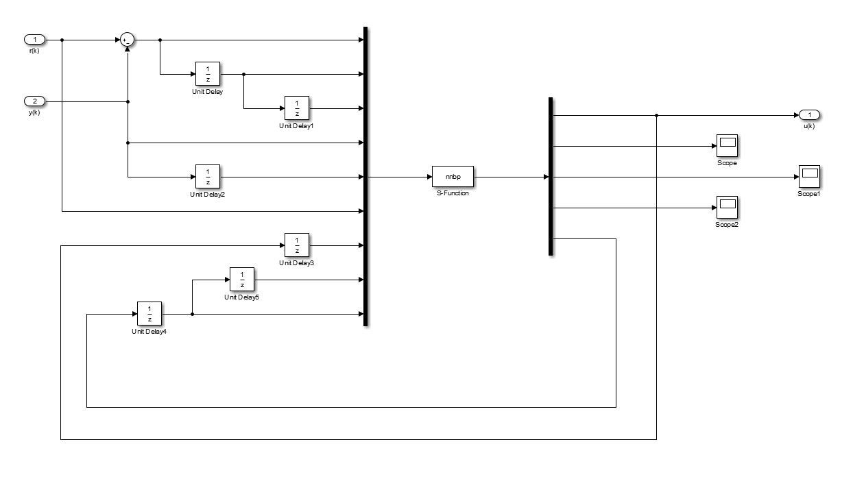 S-function的输入为:u=[e(k);e(k-1);e(k-2);y(k);y(k-1);r(k);u(k-1);隐含层+输出层权值系数(k-2);隐含层+输出层权值系数(k-1)]=
