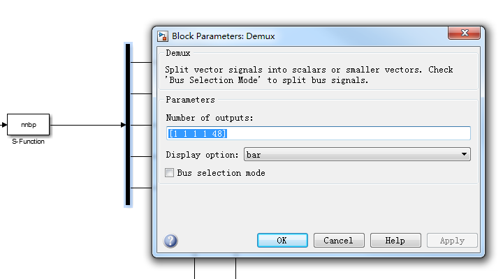 为了更好地分配S-function的输出,需要对Demux进行如下设置: