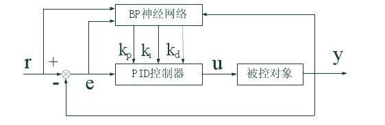 神经网络具有任意非线性表达能力,可以通过对系统性能的学习来实现具有最佳组合的PID控制。利用BP神经网络可以建立参数Kp,Ki,Kd自整定的PID控制器。基于BP神经网络的PID控制系统结构框图如下图所示: