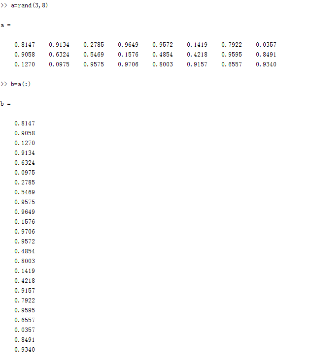 通过reshape函数,从列向量里任意组成矩阵如c=reshape(b,3,8),b中元素按顺序排成一个3*8的矩阵,也就是还原了矩阵a,