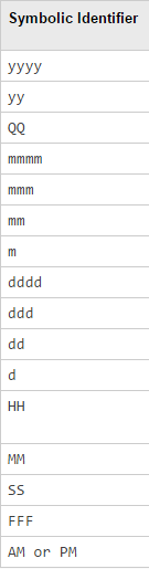 注意:描述日期和时间格式的符号标识符与描述日期时间数组的显示格式的标识符不同。