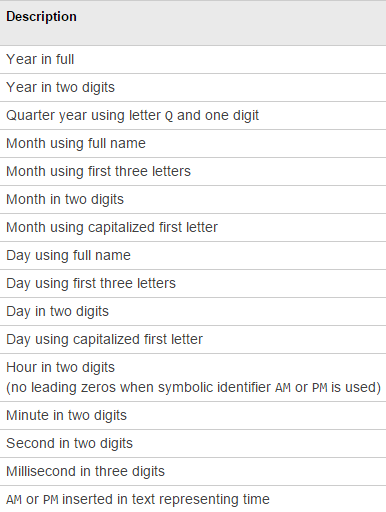 注意:描述日期和时间格式的符号标识符与描述日期时间数组的显示格式的符号标识符不同。
