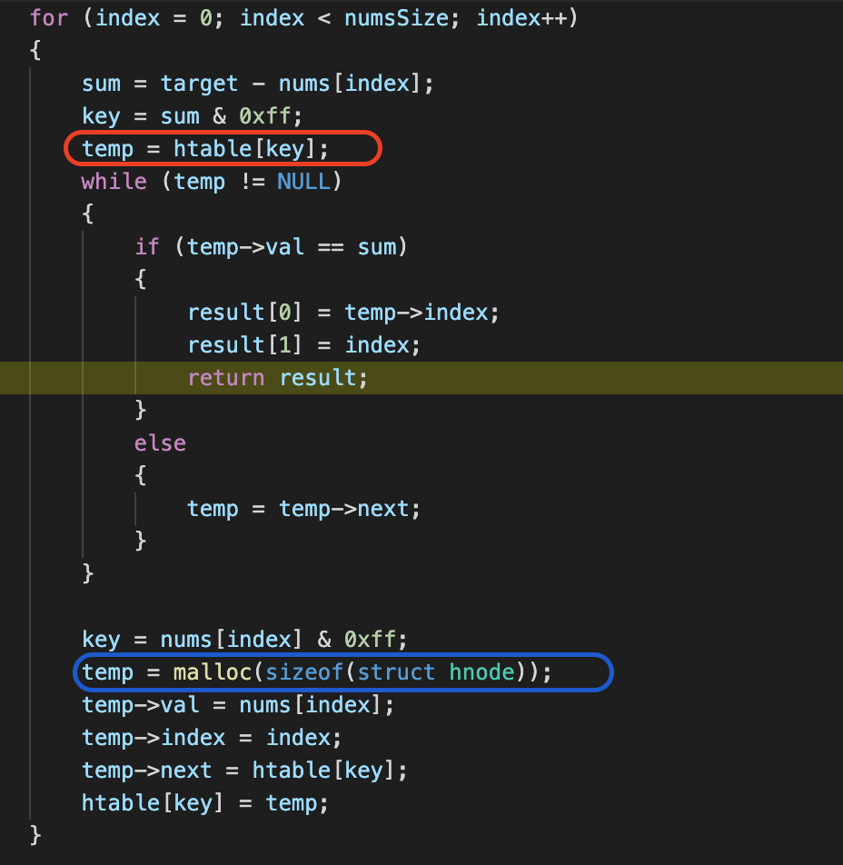 int* twoSum(int* nums, int numsSize, int target, int* returnSize){