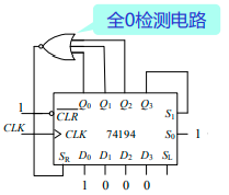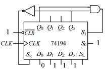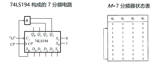 扭环计数器输出波形的频率比时钟频率降低了2n倍,所以 它可以用作偶数分频器。如果将反馈输入方程改为 ,则可以构成奇数分频器,其模值为 M=2n-1。 下图是用 74LS194 构成的 7 分频电路。