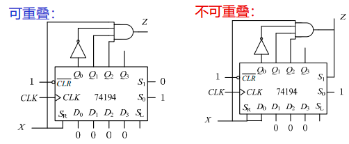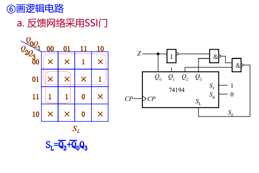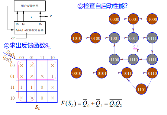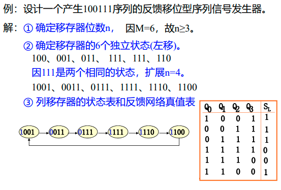 | 移位型: | ①根据序列信号长度M,确定 移存器位数n。 ②确定移存器的M个独立状态。 ③根据M个状态列出移存器的 态序表和反馈函数表,求出反馈函数SR(SL) 。 ④检查自启动性能。 设计过程较复杂,只能产生一 个序列 |