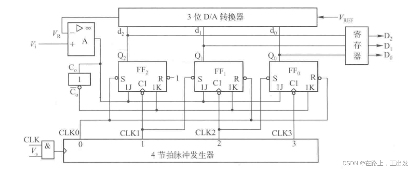 逐次逼近型 A/D转换器的工作原理类似于用砝码称重,一个时钟周期操作一次确定一个比特,所以至少需要8个时钟周期才能完成A/D量化,但是芯片实际工作还需要额外的两个时钟来完成数据清除和输出。因此对于时钟频率为 f_clk Hz 的 n 位逐次逼近型A/D芯片,完成一次转换的时间为