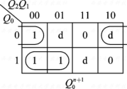 存在孤立状态,因此不能自启。通过修改电路设计,可以避免不能自启动的问题。解决方法:改变卡诺图的圈法。如果希望能尽量使用任意项,那么只能对图( a )和图( c )的圈法作修改。 现选择对图( c )的圈法作修改,即仅改变 Q 0 Q_0 Q0 的转移,改进后的 Q 0 Q_0 Q0 卡诺图: