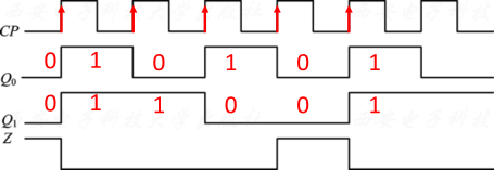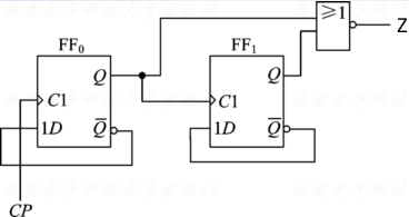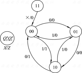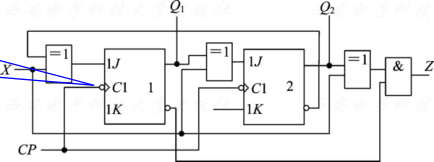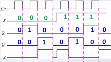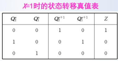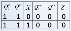 - 输出方程: Z = ( X ⊕ Q 2 n ) ⋅ Q 1 n ‾ Z = (X oplus Q^n_2) cdot overline {Q^n_1} Z=(X⊕Q2n)⋅Q1n