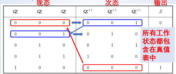 检查电路能否从 非工作状态 (未出现在状态转移真值表中的状态) 进入工作状态