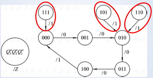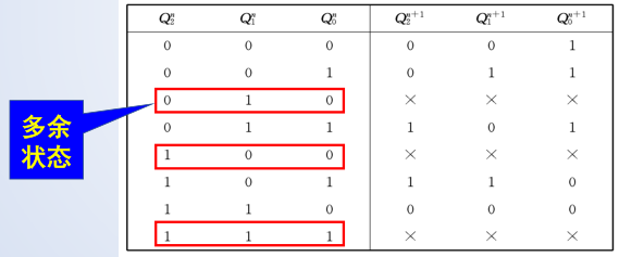 当所设计的电路中,触发器能表示的状态数大于有效状态数时,需要对所设计的电路进行实际工作状态讨论。