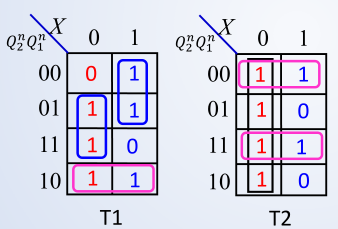 对T1和T2的卡诺图进行化简,得到T1和T2的逻辑表达式: