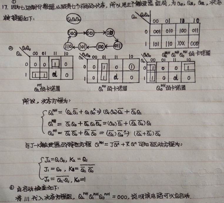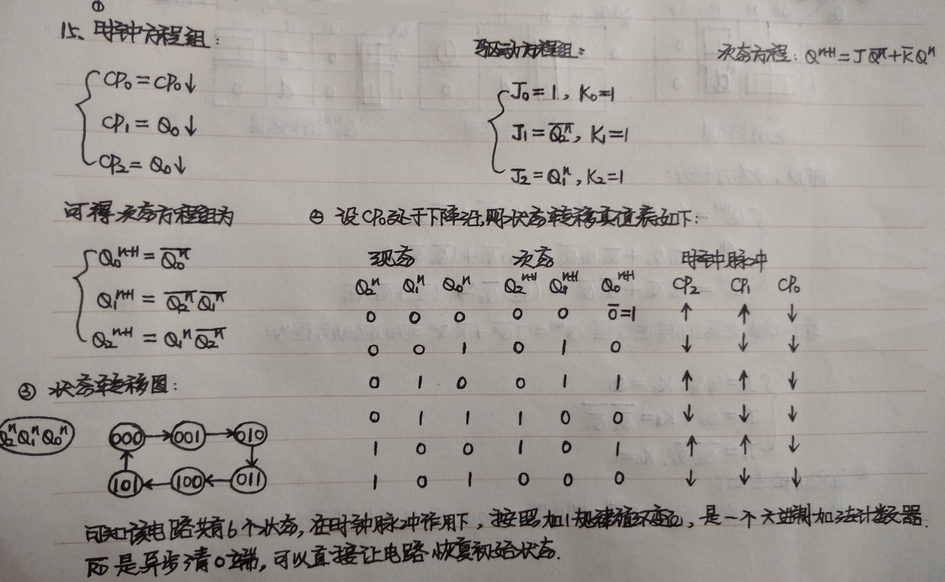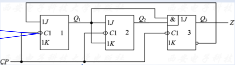 { J 1 = Q 3 ‾ , K 1 = 1 J 2 = Q 1 n , K 2 = Q 1 J 3 = Q 1 n Q 2 n , K 3 = 1 left { begin{aligned} &J_1 = overline {Q_3}, K_1= 1\ &J_2 = Q^n_1, K_2 = Q_1\ &J_3 = Q^n_1Q^n_2, K_3 = 1 end{aligned} right. ⎩⎪⎨⎪⎧J1=Q3,K1=1J2=Q1n,K2=Q1J3=Q1nQ2n,K3=1 - 次态方程:这是下降沿触发的J-K触发器,因此 Q n + 1 = J Q n ‾ + k ‾ Q n Q^{n+1} = J overline {Q^n} + overline k Q^n Qn+1=JQn+kQn