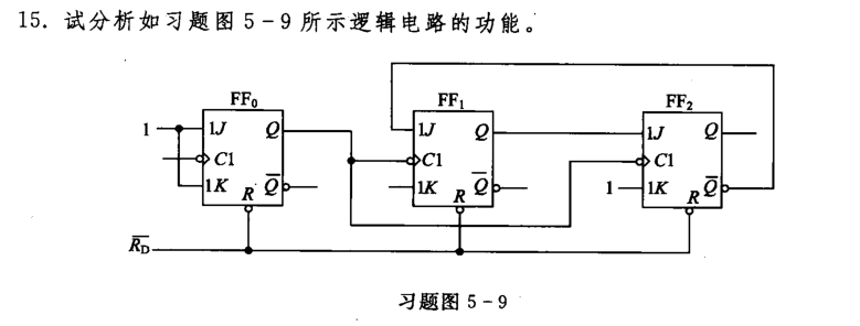 由于时钟脉冲控制状态从 000 − 001 − 010 − 011 − 100 − 000 000-001-010-011-100-000 000−001−010−011−100−000,循环变换,逢五进一,可知,该电路是一个同步的五进制计数器