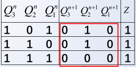 left { begin{aligned} &Q^{n+1}_1 = overline {Q^n_3} overline {Q^n_1} \ &Q^{n+1}_2 = Q^n_1overline {Q^n_2} + overline {Q^n_1}Q^n_2 = Q^n_1 oplus Q^n_2\ &Q^{n+1}_{3} = Q^n_1Q^n_2overline {Q^n_3} end{aligned} right.