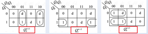 left { begin{aligned} &Q^{n+1}_{2} =Q_1^n overline {Q^n_2} + overline {Q^n_1}Q^n_2\ &Q^{n+1}_1 = Q^n_0 overline {Q_1^n} \ &Q^{n+1}_0 = overline {Q^n_1} overline {Q^n_0} + overline {Q^n_2} Q^n_0 end{aligned} right. left { begin{aligned} &J_{2} =Q_1^n, K_2 = {Q^n_1}\ &J_1 = Q^n_0, K_1 = 1\ &J_0 = overline {Q^n_1}, K_0 = {Q^n_2} end{aligned} right.