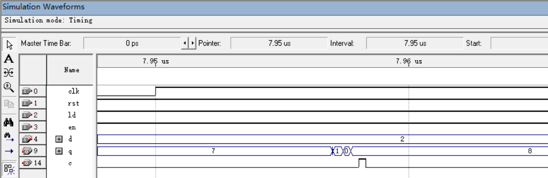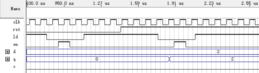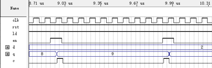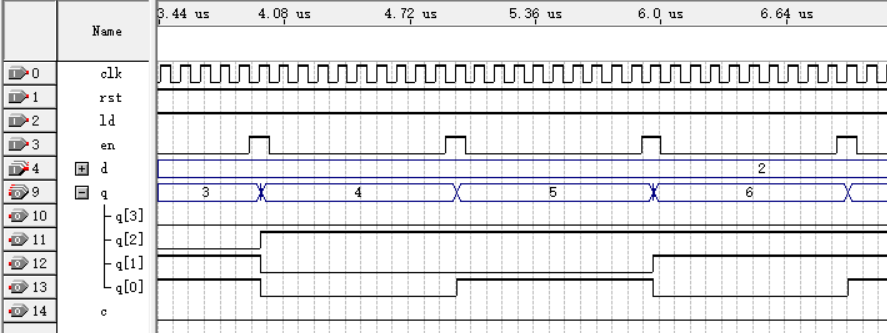 输入端优先级:rst>ld>en。当rst=0时,ld、en无效,计数器处于复位状态;当rst=1,ld=0时,en无效,计数器处于置数状态,下一个clk上升沿处将d中的数直接置入q中,效果如下图所示: