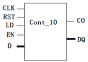 由于实验板上晶振频率太高,对时钟信号直接计数人眼无法直接观察,为此需要对时钟信号进行分频,使频率变为1Hz之后再计数可直接观察计数过程。为了使得计数和分频均基于同一个计数器来实现,需要设计一个通用的十进制计数器,其计数方式为0,1,2,…8,9,0,…,同时须具有复位、置数及维持等功能。通用十进制计数器的符号及功能表如下图所示。