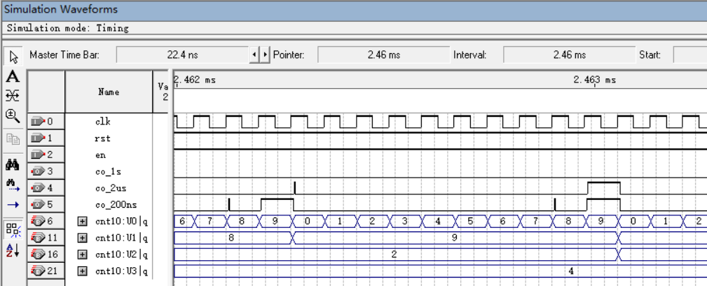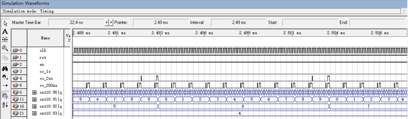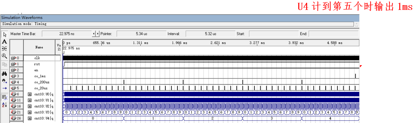 如需产生1ms输出,则co_1ms=en4 | en3 & q4[2] & ~(q4[1] | q4[0]),即q4=100,计到第五个200us时输出。