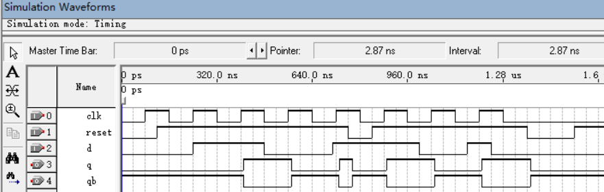 (6)点击Processing→Simulator Tool,打开d_ff.vmf文件,先点击Start,仿真成功后再点击Report,仿真波形输出如下图所示。