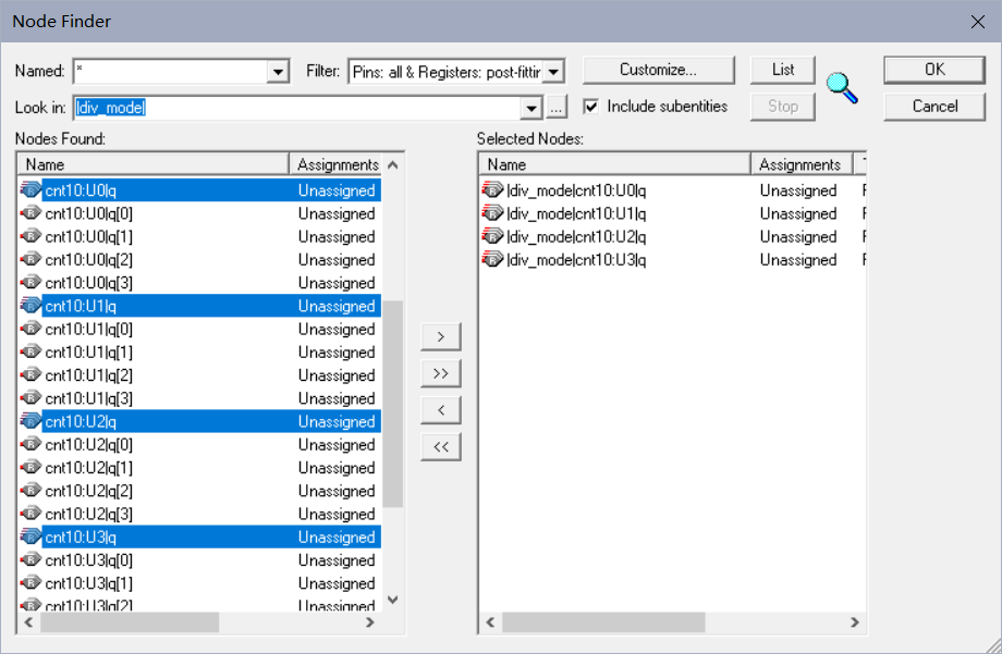 (3)新建仿真文件Vector Waveform File,保存为div_mode.vmf。在Filter一栏选中“所有管脚”后,将所有节点全部添加至窗口中。再把Filter一栏改成“Pins:all®istors”后,选中U0-U3管脚将其加入,如下图所示。