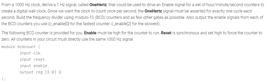 From a 1000 Hz clock, derive a 1 Hz signal, called OneHertz, that could be used to drive an Enable signal for a set of hour/minute/second counters to create a digital wall clock. Since we want the clock to count once per second, the OneHertz signal must be asserted for exactly one cycle each second. Build the frequency divider using modulo-10 (BCD) counters and as few other gates as possible. Also output the enable signals from each of the BCD counters you use (c_enable[0] for the fastest counter, c_enable[2] for the slowest).
