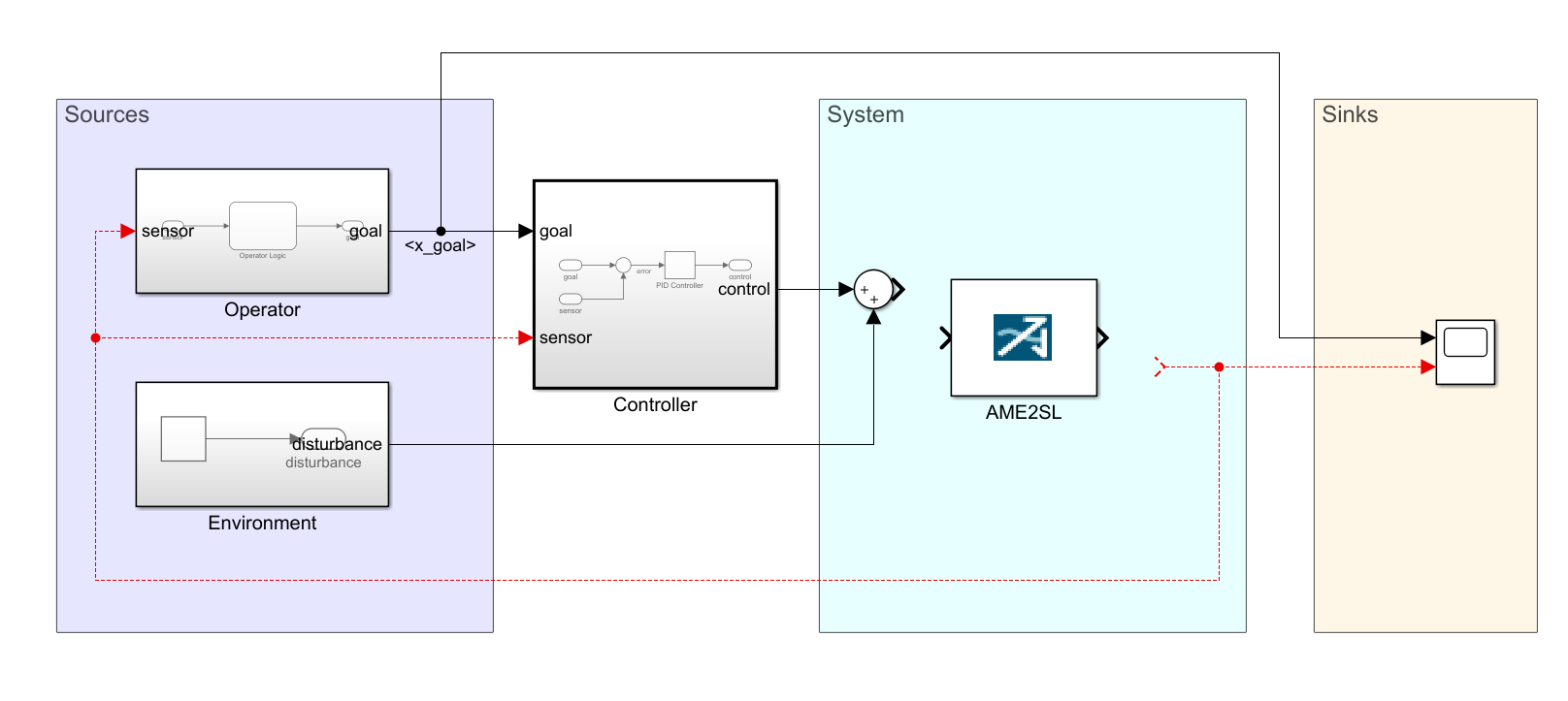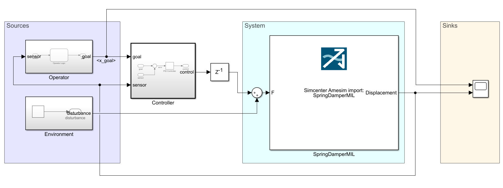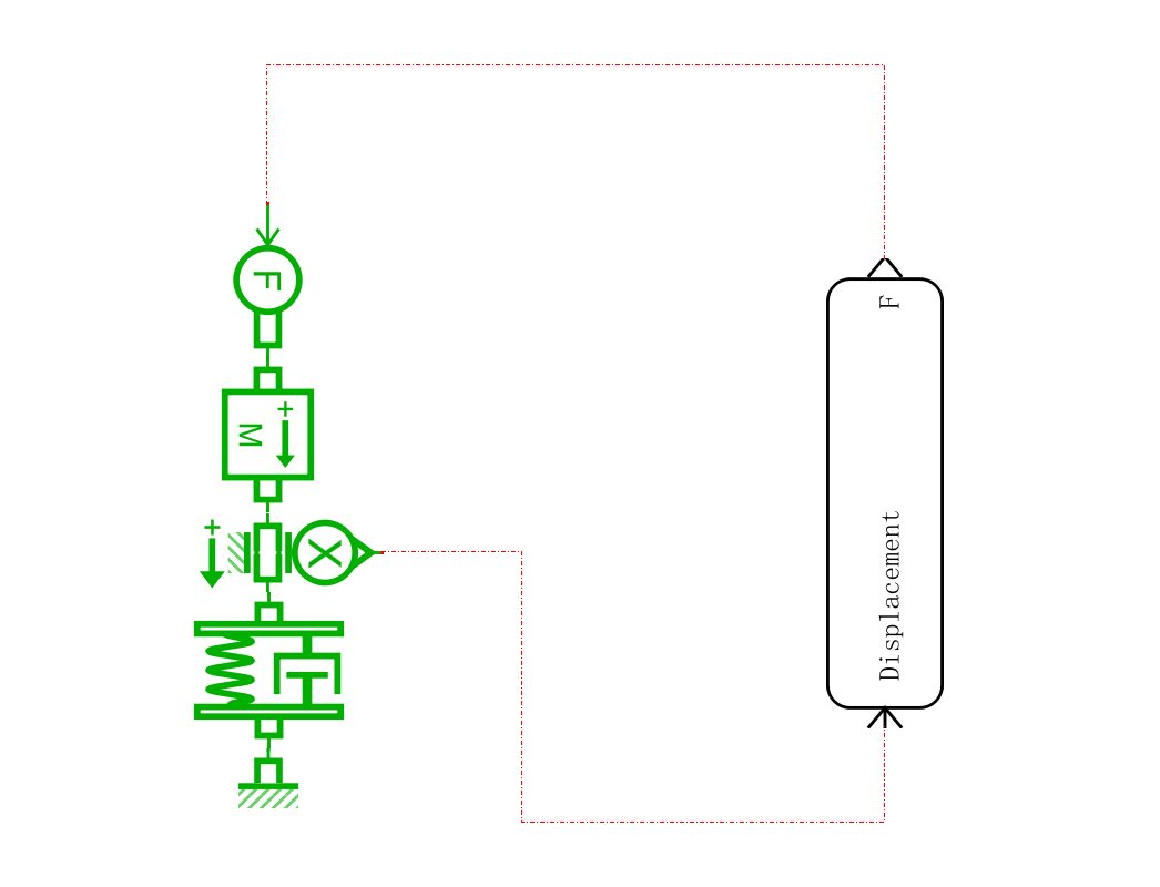 么如果我不知道这种关系呢?这时候AMESIM就能派上用场啦,AMESIM可以很方便地对物理系统进行建模,即使我不知道他们的关系。然后我们可以像之前的联合仿真一样把建好的物理系统嵌入到Simulink模型中(取代下面蓝色System区域内的模块),下面就来试试吧。