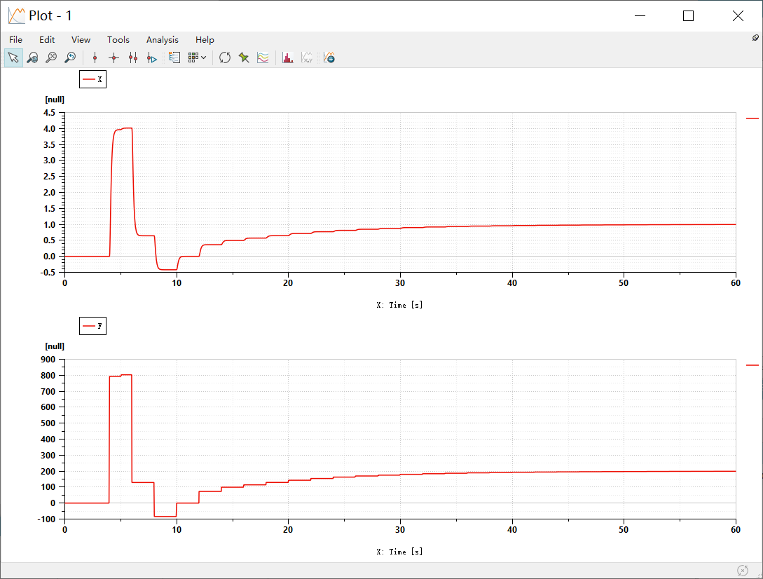 打开AMESIM就可以看到仿真的效果啦,虽然好像波动有点大,但是最后还是控制在了目标位置x=0.5了: