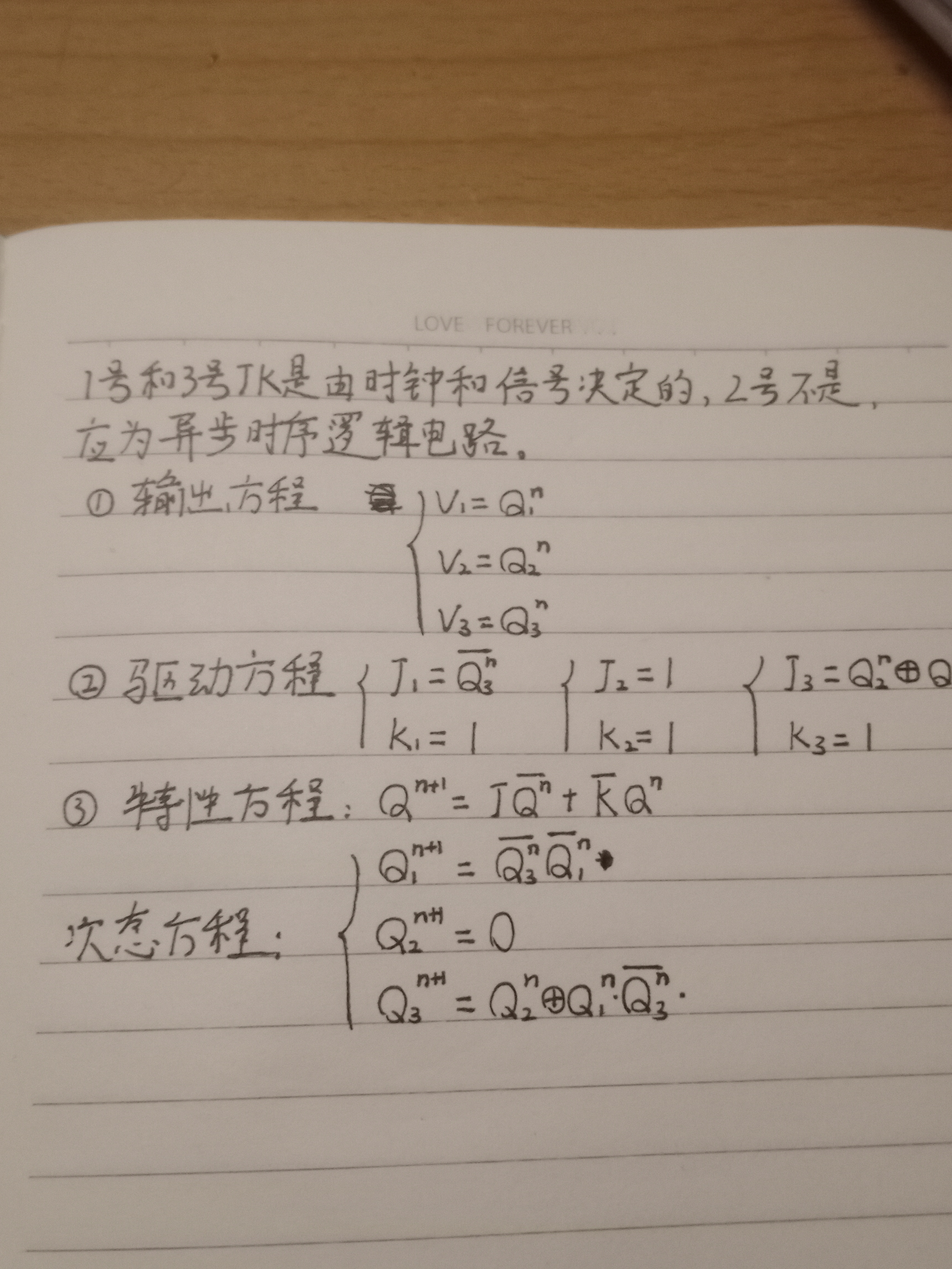 这里最后那个Q2的次态方程写错了,应该是Q2的n次方取反。还有Q3的次态方程,应该再加一个括号。