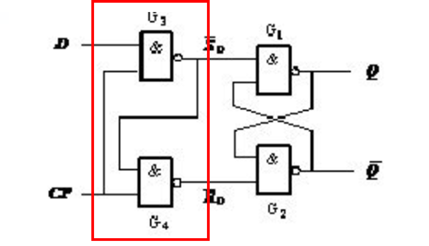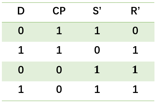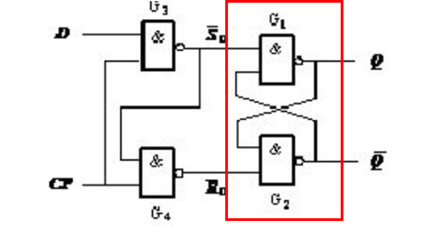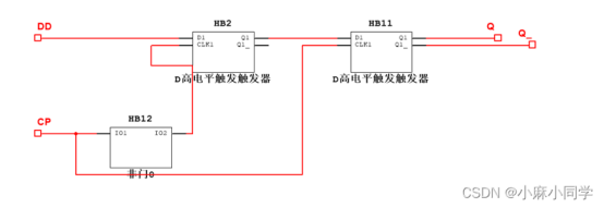 当 CP 信号为 0 时,通过非门输入第一个触发器为 1,第一个触发器就会输出 D 相同的值,第二个触发器保持输出。当 CP 信号为 1 时,第一个触发器保持输 出,第二个触发器读取第一个触发器的输出值并输出,这就构成了一个上升沿 触发的 D 触发器