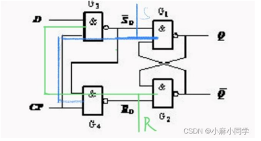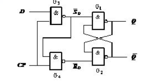 利用与非门有 0 出 1 的特性,插入 S 和 R,将二输入与非门变成三输入与非 门,在电路中先将 S 定为 1 此时当 R 为 1 时,对与非门电路无影响, 当 R 为 0 时,无论 D 和 CP 取值如何,输出的 Q 固定为 0