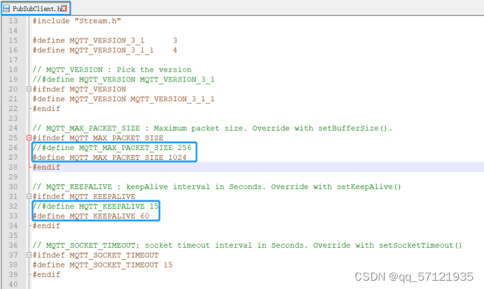 安装完所有的固件库后,还要进行以下文件的修改 ,修改刚刚下载库中的PubSubClient.h文件,此步是关键步骤,不修改将导致无法连接上阿里云平台。