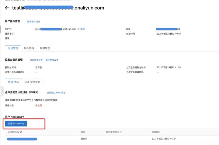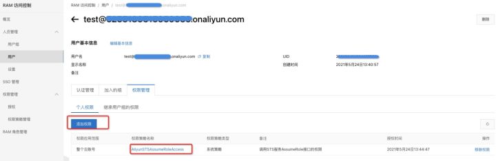 - 给子账号授予AliyunSTSAssumeRoleAccess权限。