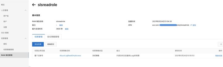 - 在主账号下创建出具有sls读权限读slsreadrole角色,具有AliyunLogReadOnlyAccess权限。