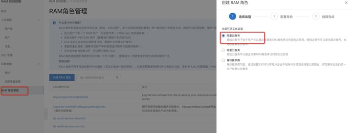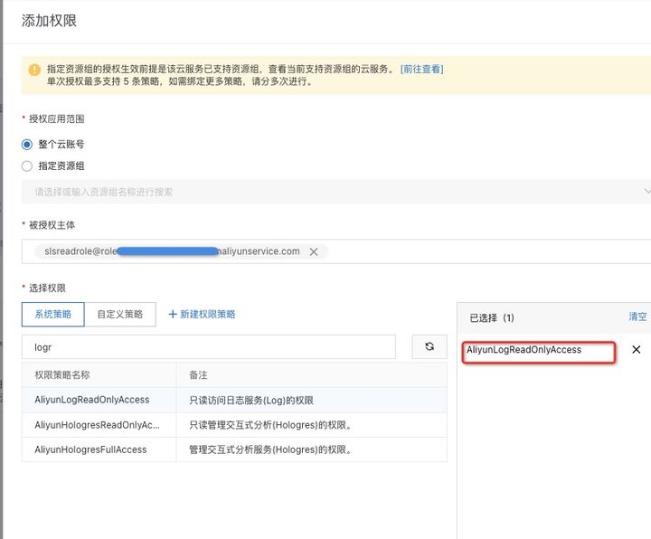 - 主账号下创建角色,授予当前账号AliyunLogReadOnlyAccess权限。