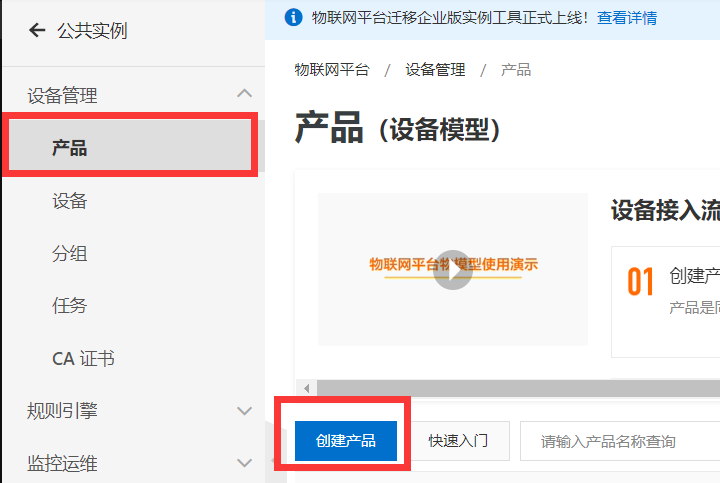 进入物联网控制台后,打开公共实例,找到设备管理菜单栏下的产品,并点击创建产品