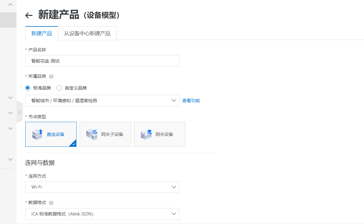 进入产品创建页面后,我们先输入产品名称,eg:智能花盆 然后选择产品所属品类,这一步没有太严格的要求,然后节点类型选择直连;联网方式为WiFi,ICA数据格式,保持默认即可,最后点击确认,在弹出的页面选择返回产品列表