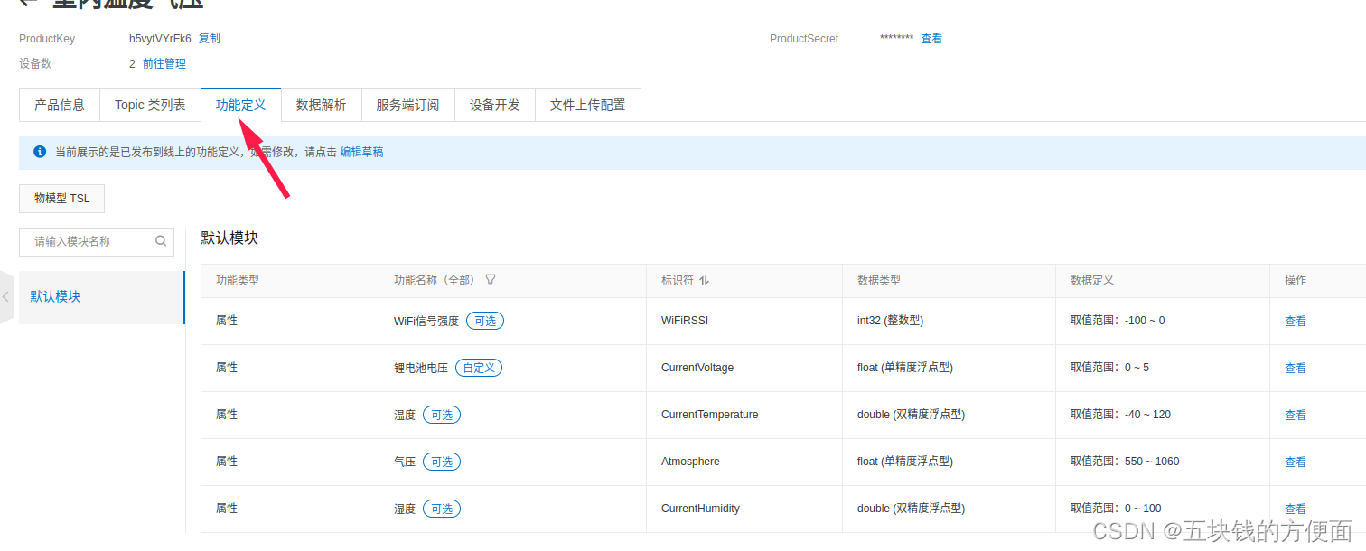 订阅后在设备的调试界面,对产品定义的几个属性做设置,这时候MQTTX应该能收到服务器下发的topic信息,这样就能得到报文的json格式,属性的标识符见产品的功能定义,这里面还可以对产品属性做修改。比如标识符,数据类型,取值范围,布进。除了里面默认有的,还可以自定义功能。