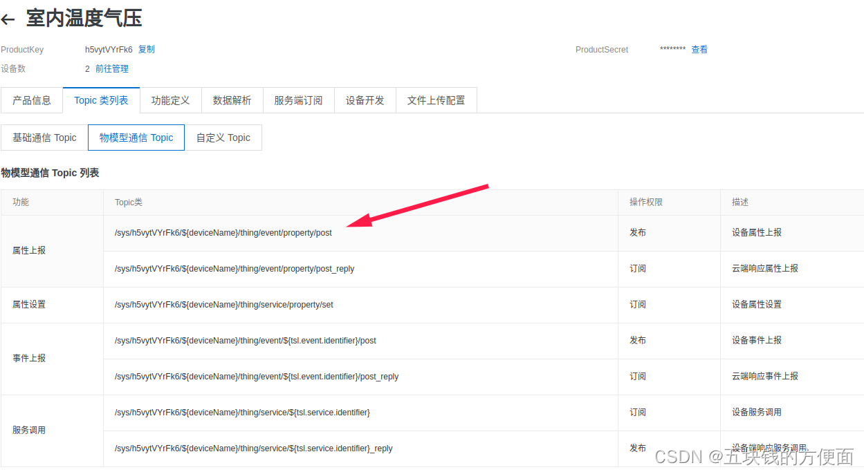 服务器的topic在产品的topic类列可以看到,已经有很多现成的topic了,也可以自定义topic,我只想通过服务器获取esp8266上报的温度气压电压等信息,所以客户端不需要订阅,但这里为了获取8266要push的json报文格式,所以选下面的属性设置 订阅一个。
