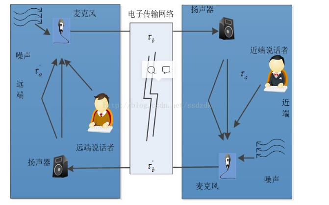 当远端Far-end有说话者讲话时,声音会传到近端(Near-end)的扬声器,然后声音通过空间延时和传输延时重新回到了远端。这样就造成了声学回声。近端到远端的流程也有同样声学回声,在此仅仅描述近端的流程.