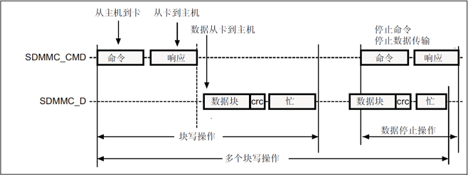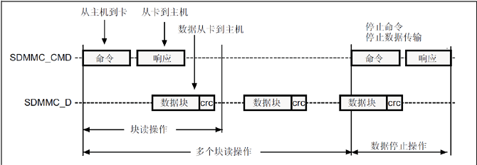下图是读的过程,从机在收到主机相关命令后,开始发送数据块给主机,所有数据块都带有CRC校验值(CRC由SDMMC硬件自动处理),单个数据块读的时候,在收到1个数据块以后即可以停止了,不需要发送停止命令(CMD12)。但是多块数据读的时候,SD卡将一直发送数据给主机,直到接到主机发送的STOP命令(CMD12)。