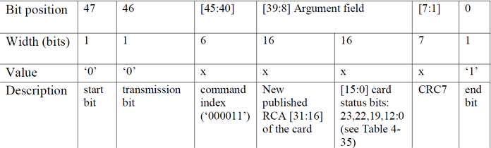 CMD3,用于设置卡相对地址(RCA,必须为非0),对于SD卡(非MMC卡),在收到CMD3后,将返回一个新的RCA给主机,方便主机寻址。RCA的存在允许一个SDMMC接口挂多个SD卡,通过RCA来区分主机要操作的是哪个卡。而对于MMC卡,则不是由SD卡自动返回RCA,而是主机主动设置MMC卡的RCA,即通过CMD3参数(高16位用于RCA设置),实现RCA设置。同样MMC卡也支持一个SDMMC接口挂多个MMC卡,不同于SD卡的是所有的RCA都是由主机主动设置的,而SD卡的RCA则是SD卡发给主机的。