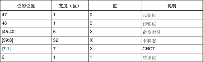 command index 的内容为它响应的命令的编码,如当我们向SD卡发送CMD3(编码:000011)命令时,它返回的响应R6的command index 内容即为000011。