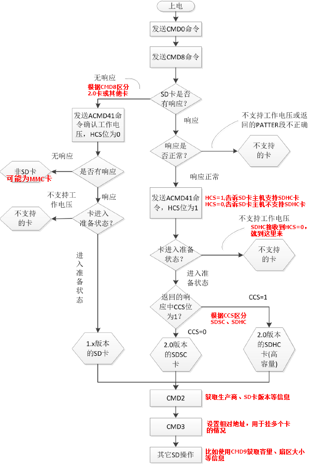 接着发送CMD8,如果有响应,卡就是2.0卡,继续发送ACMD41,接收响应,如果响应中的CCS位为1,卡就是SDHC,如果CCS为0,卡就是SDSC。如果CMD8无响应,那么卡就是1.0卡,发送ACMD41,接收响应,根据响应中的31位判断卡是否进入准备状态。
