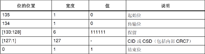 SD卡在收到CMD2后,将返回R2长响应(136位),其中包含128位有效数据(CID寄存器内容),存放在SDMMC_RESP1~4等4个寄存器里面。通过读取这四个寄存器,就可以获得SD卡的CID信息。