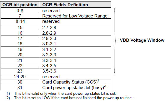ACMD41得到的响应(R3)包含SD卡OCR寄存器内容,OCR寄存器内容定义如下: