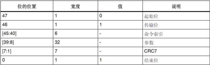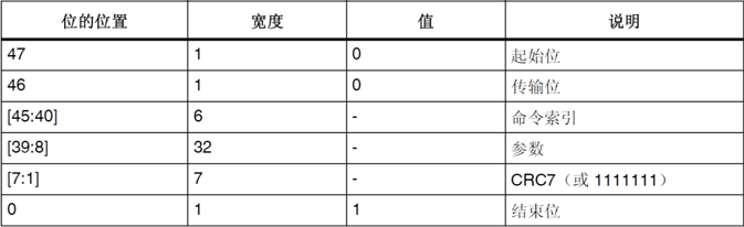 所有的命令都是由主机发出,其中起始位、传输位、CRC7和结束位由SDIO硬件控制,我们需要设置的就只有命令索引和参数部分。命令索引是命令的ID号,比如CMD0、CMD1之类的。有些命令会包含参数,如读命令就包含要读数据的地址,这些命令参数就存放在参数[39:8]。