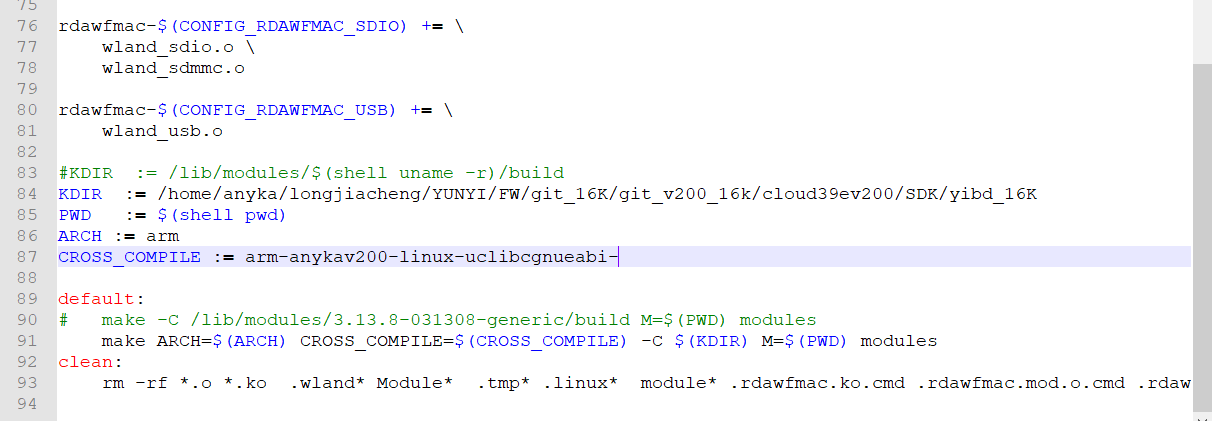 图中KDIR := /home/anyka/longjiacheng/YUNYI/FW/git_16K/git_v200_16k/cloud39ev200/SDK/yibd_16K的内容,需要使用你们自己的内核编译路径。