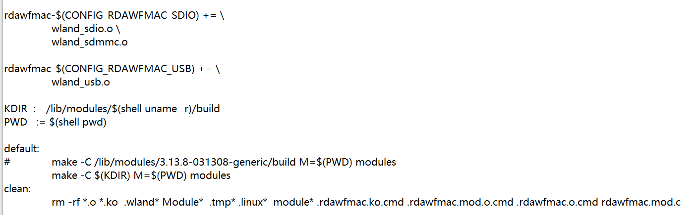 2、在RDA5995rdaw80211rdawlan下面有支持usb和sdio的两个makefile,我们只针对usb接口的讲解(只有usb的硬件,没有sdio的硬件),将RDA5995rdaw80211rdawlanmakefile_usb替换这个目录下面的makefile。