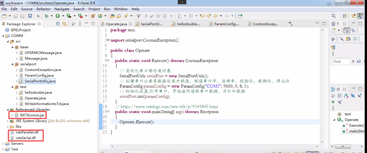 打开Eclipse,文件->新建Java Project,输入项目名称为COMM,同时选择对应的JAVA JDK 1.8后确定即可,然后在src文件夹下新建三个Package包(bean、serialport和test),并在bean包下新建GPSRMCMessage类,在serialport包下新建CostomException类、ParamConfig类和SerialPortUtil类,在test包下新建hellodouble类和Operate类。